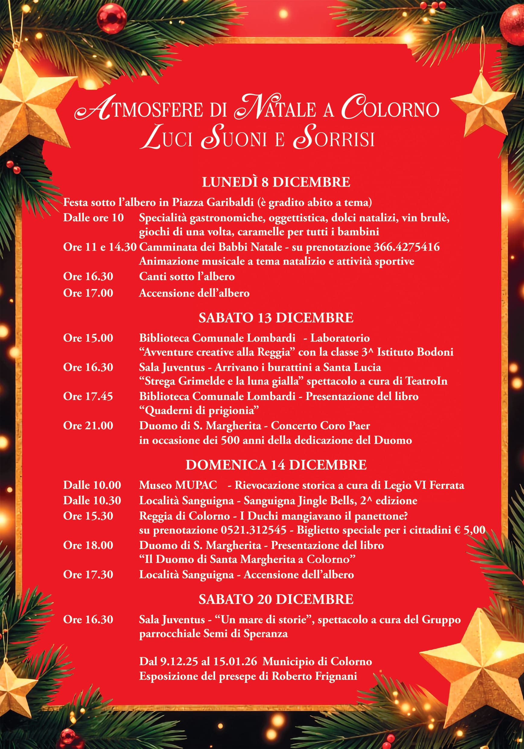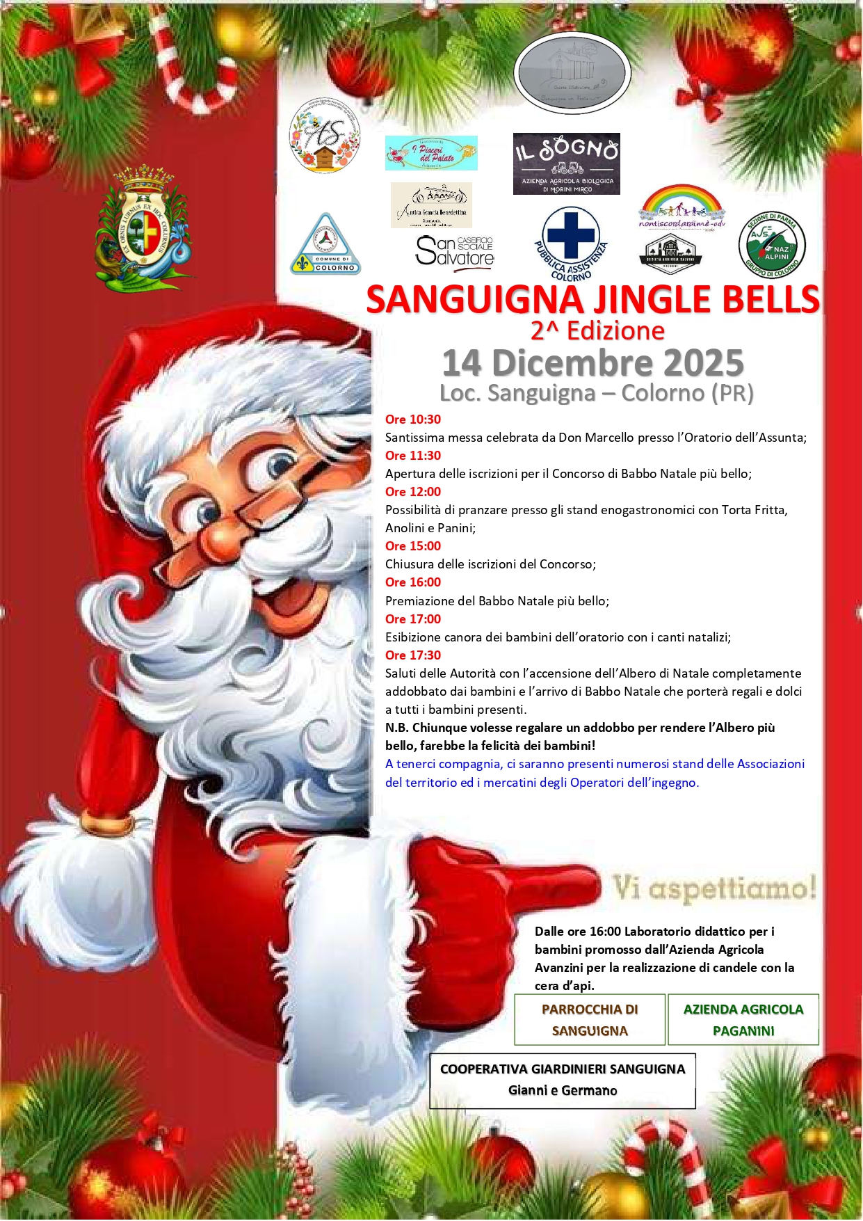 2^ edizione 14 Dicembre 2025 Loc. Sanguigna – Colorno (PR) Ore 10:30 Santissima messa celebrata da Don Marcello presso l’Oratorio dell’Assunta; Ore 11:30 Apertura delle iscrizioni per il Concorso di Babbo Natale più bello; Ore 12:00 Possibilità di pranzare presso gli stand enogastronomici con Torta Fritta, Anolini e Panini; Ore 15:00 Chiusura delle iscrizioni del […]