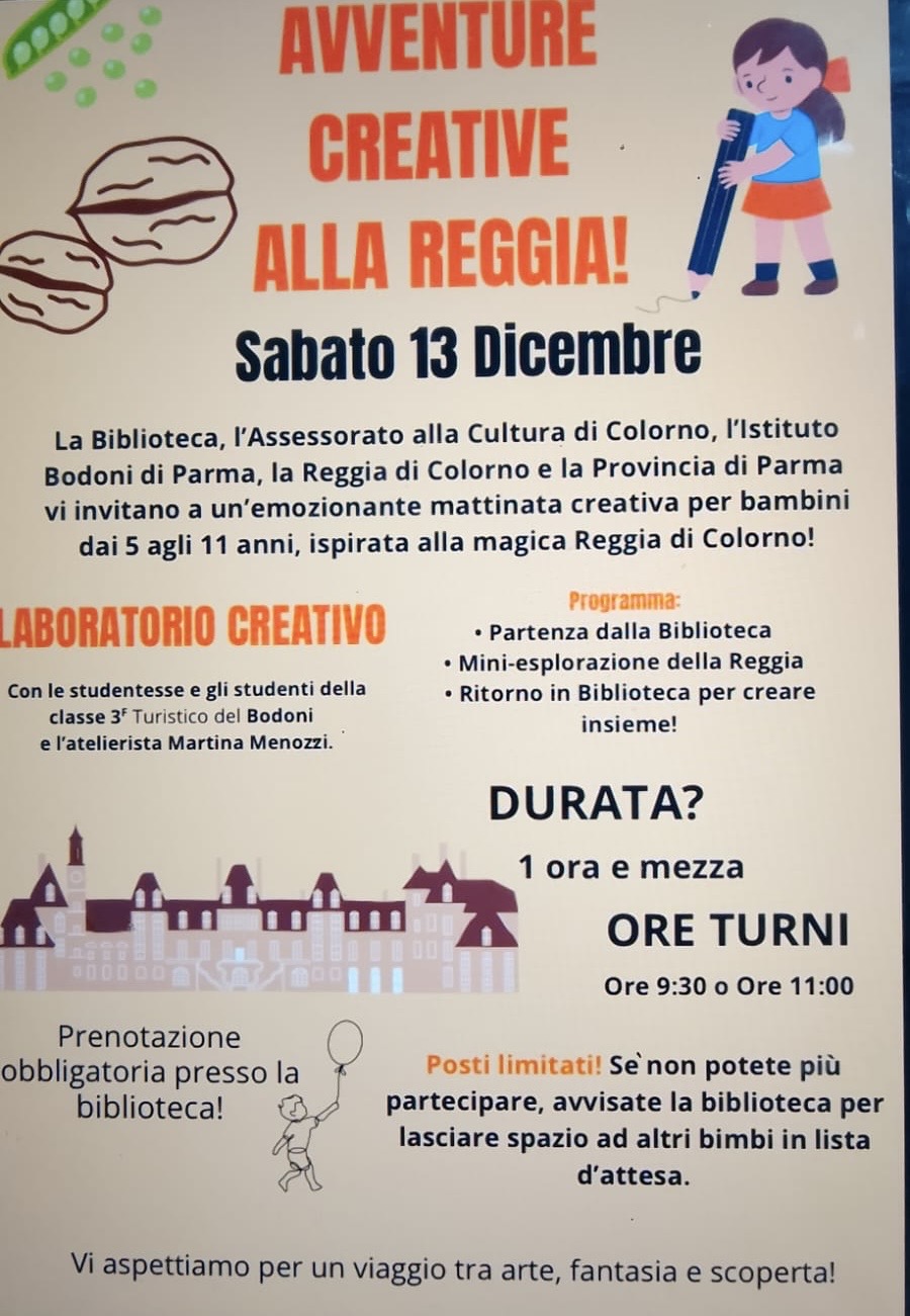 Sabato 13 dicembre 2025 due turni ore 9.30 e ore 11. Prenotazione obbligatoria presso la Biblioteca. Per Bambini dai 5 agli 11 anni Programma: Partenza dalla biblioteca, mini esplorazione della Reggia, ritorno in biblioteca per creare insieme.