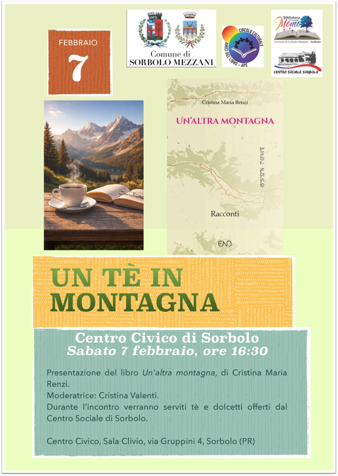 Viaggio tra le vette e i racconti Il Comune di Sorbolo Mezzani, in collaborazione con il Circolo Culturale Amici del Libro – APS, è lieto di invitarvi a un pomeriggio speciale dedicato alla letteratura e alla convivialità Sabato 7 febbraio ore 16:30 Centro Civico – Sala Clivio – via Gruppini 4 Sorbolo presentazione del libro […]