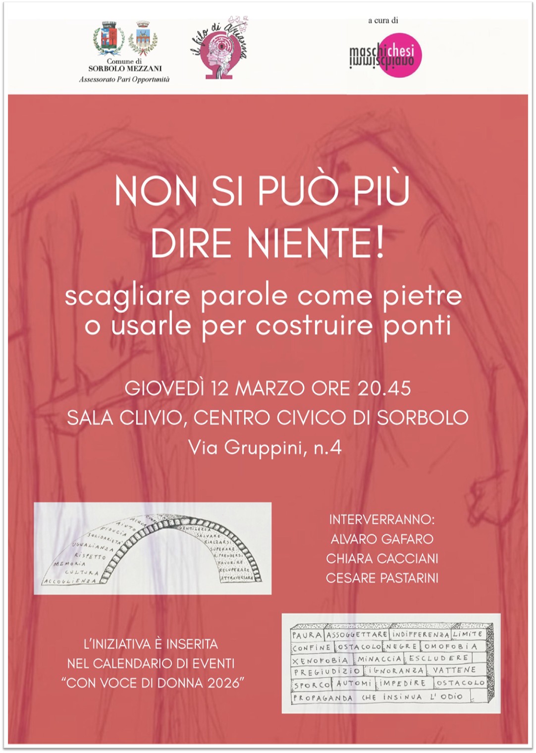 NON SI PUO’ PIU’ DIRE NIENTE Scagliare parole come pietre o usarle per costruire pomti Giovedì 12 marzo Ore 20.45 Sala Clivio – Centro Civico di Sorbolo – Via Gruppini, 4 Interverranno: • Alvaro Gafaro • Chiara Cacciani • Cesare Pastarini L’iniziativa è a cura dell’associazione Maschi Che Si Immischiano ed è inserita nel calendario […]
