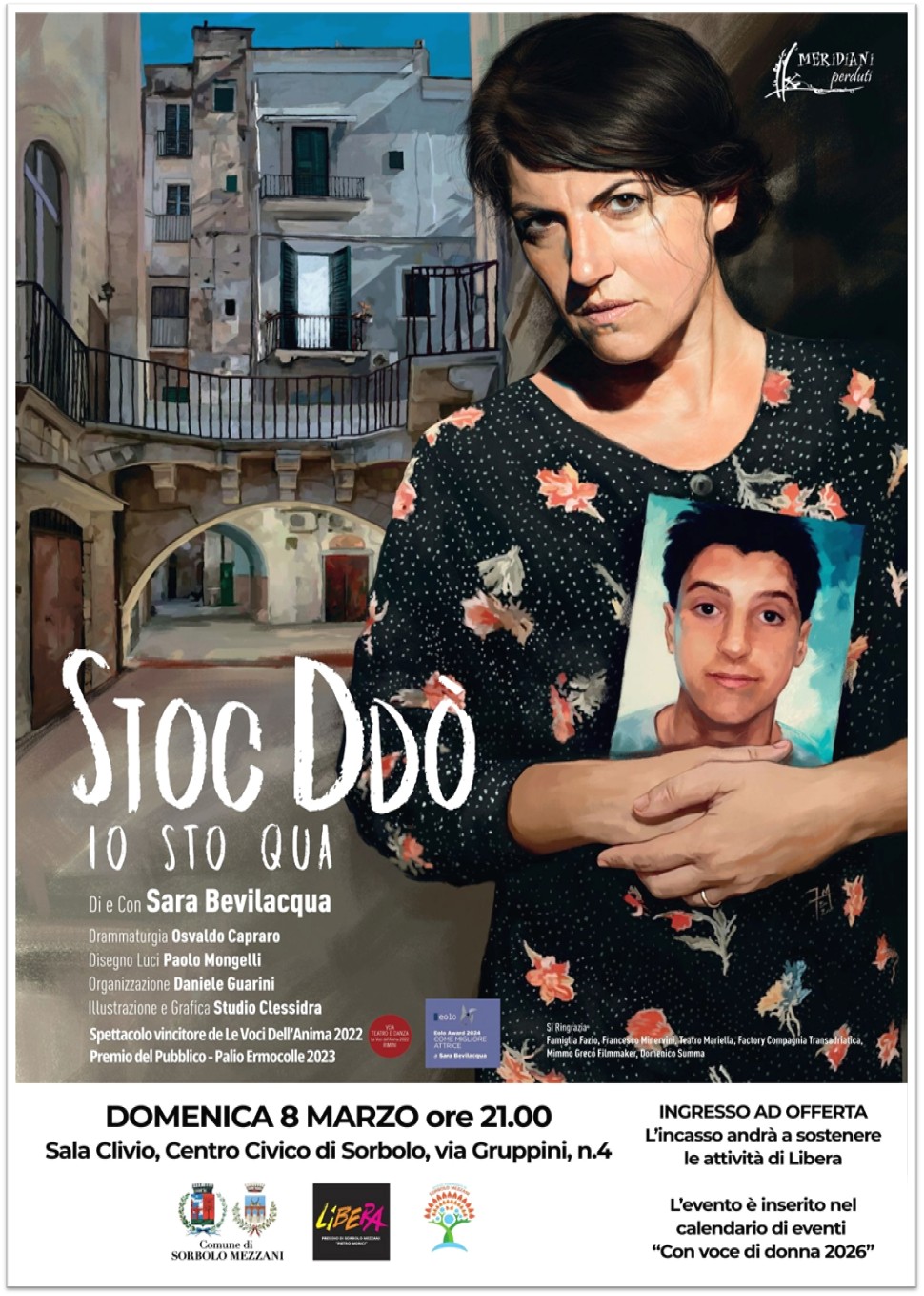 8 marzo e dintorni Comune di Sorbolo Mezzani e Associazione LIBERA Vi invitano allo spettacolo teatrale Stoc Ddò – Io sto qua di e con Sara Bevilacqua Domenica 8 marzo 2026 ore 21.00 Sala Clivio – Centro Civico di Sorbolo (Via Gruppini, 4) Regia: Sara Bevilacqua Drammaturgia: Osvaldo Capraro Organizzazione: Daniele Guarini Disegno luci: Paolo […]